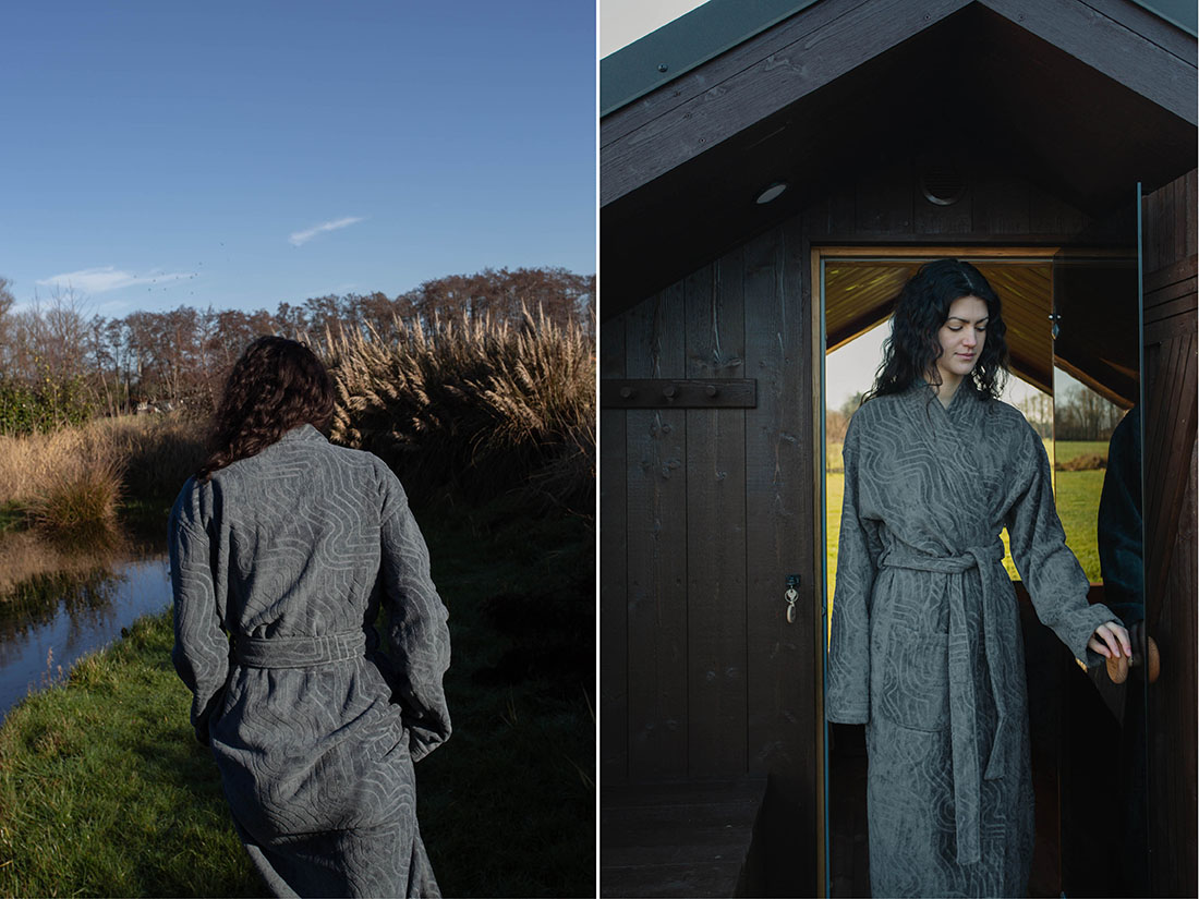 Blødere, end du nogensinde har turdet drømme om: Vores 100 % økologiske, GOTS-certificerede bomuldsvelour/-frotte er den ultimative økoluksus. Vores badeværelsestekstiler af dette stof har den velkendte frotte på den ene side og bomuldsvelour på den anden. Velour dannes, ved at frottestoffets "flortråde" skæres op, så der opstår en meget blød og glat overflade. En smuk detalje: Motivet med indvævede cirkler, som er skabt af vores eget designteam, er inspireret af japanske zenhaver. Håndklæderne er i ultimativ tyk hotelkvalitet med en tykkelse på 500 g/m².